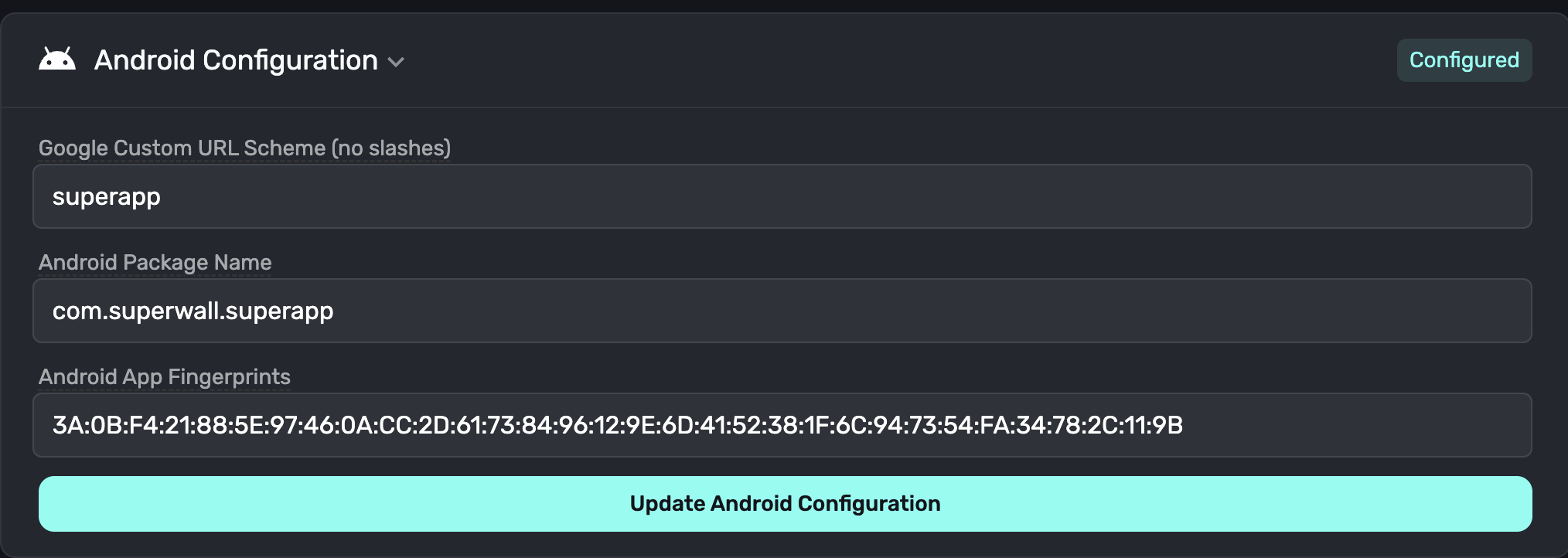 Once added, click the Update Configuration button which will ensure the application asset links are properly generated for Google to verify.