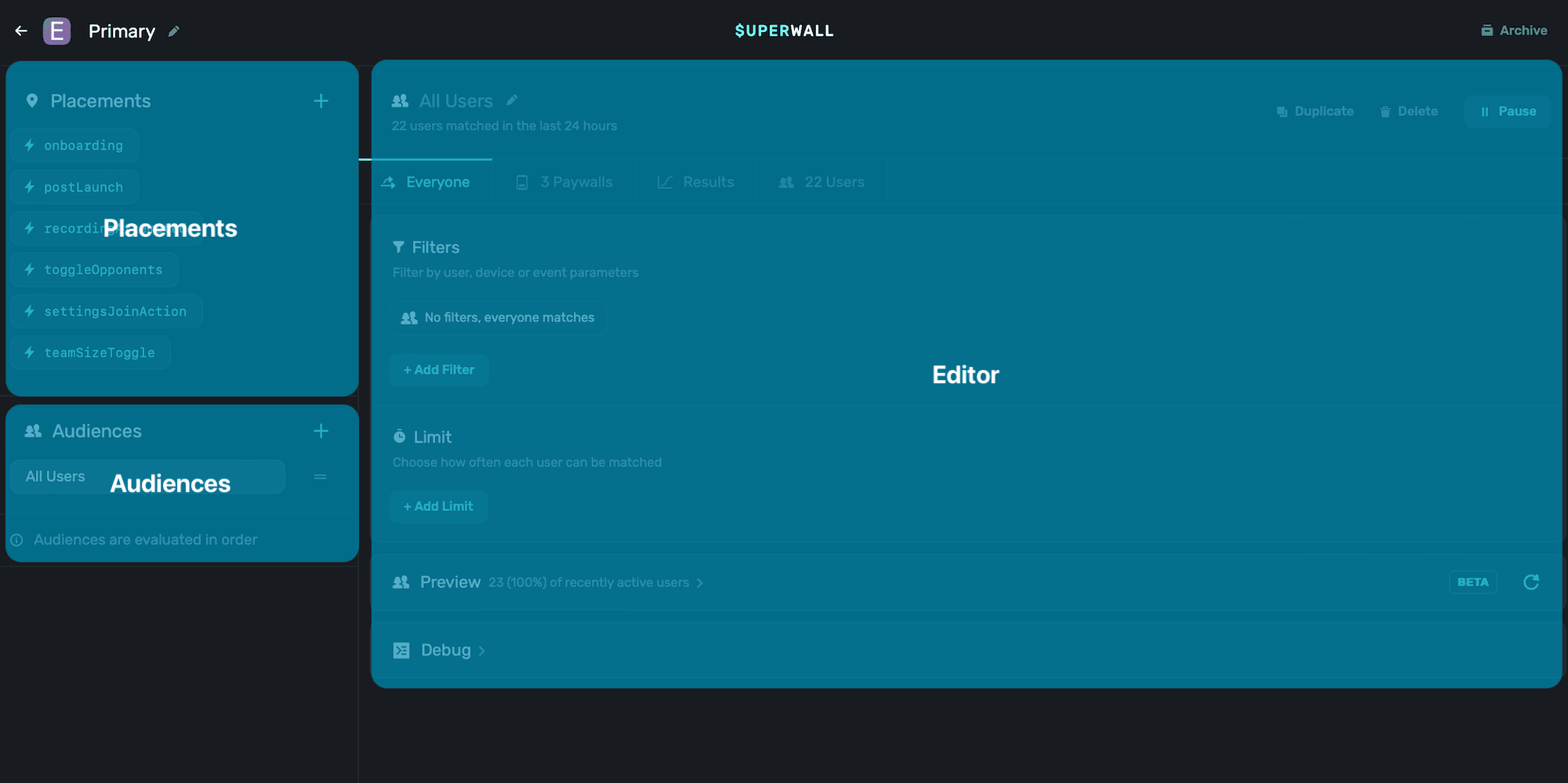 Under the placements section, you can add, pause or delete existing placements. Placements are actions, or implicit events, which you can use to show a paywall or implement feature gating. Be liberal with adding placements, you can always pause them on-the-fly without app updates. Or, if you later decide to paywall a particular feature, it gives you more flexibility if you already have a placement for that particular action.