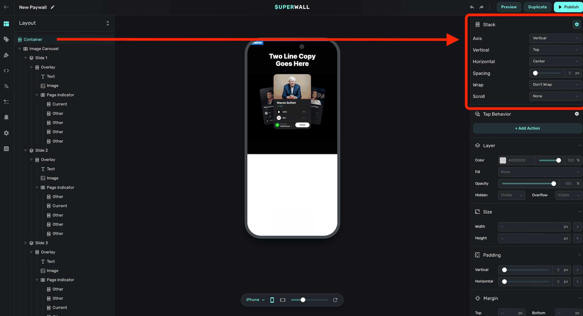 • Wrap: Specifies how items within the stack should behave when they exceed the container's width.
