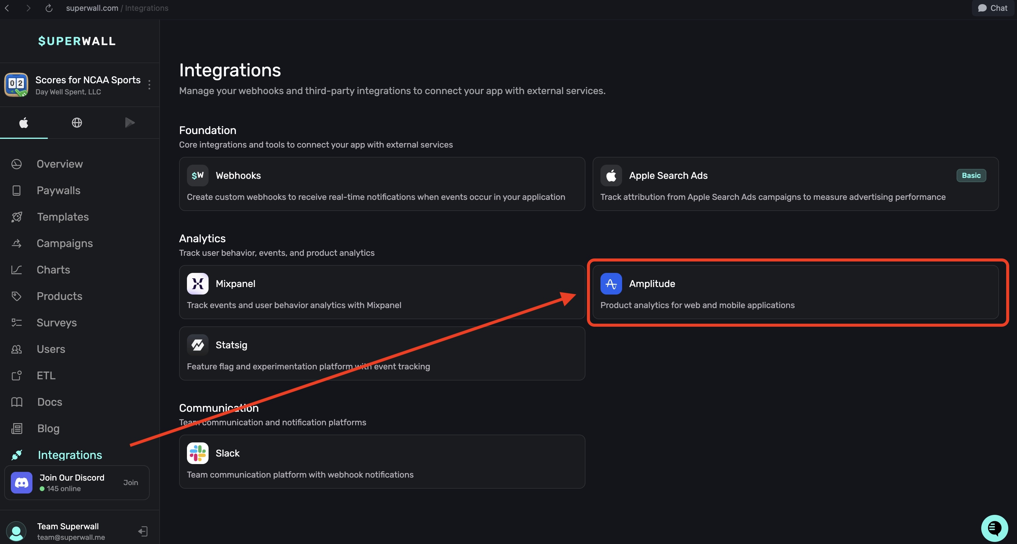 In the Analytics section within Integrations, you can connect your Amplitude account to Superwall: