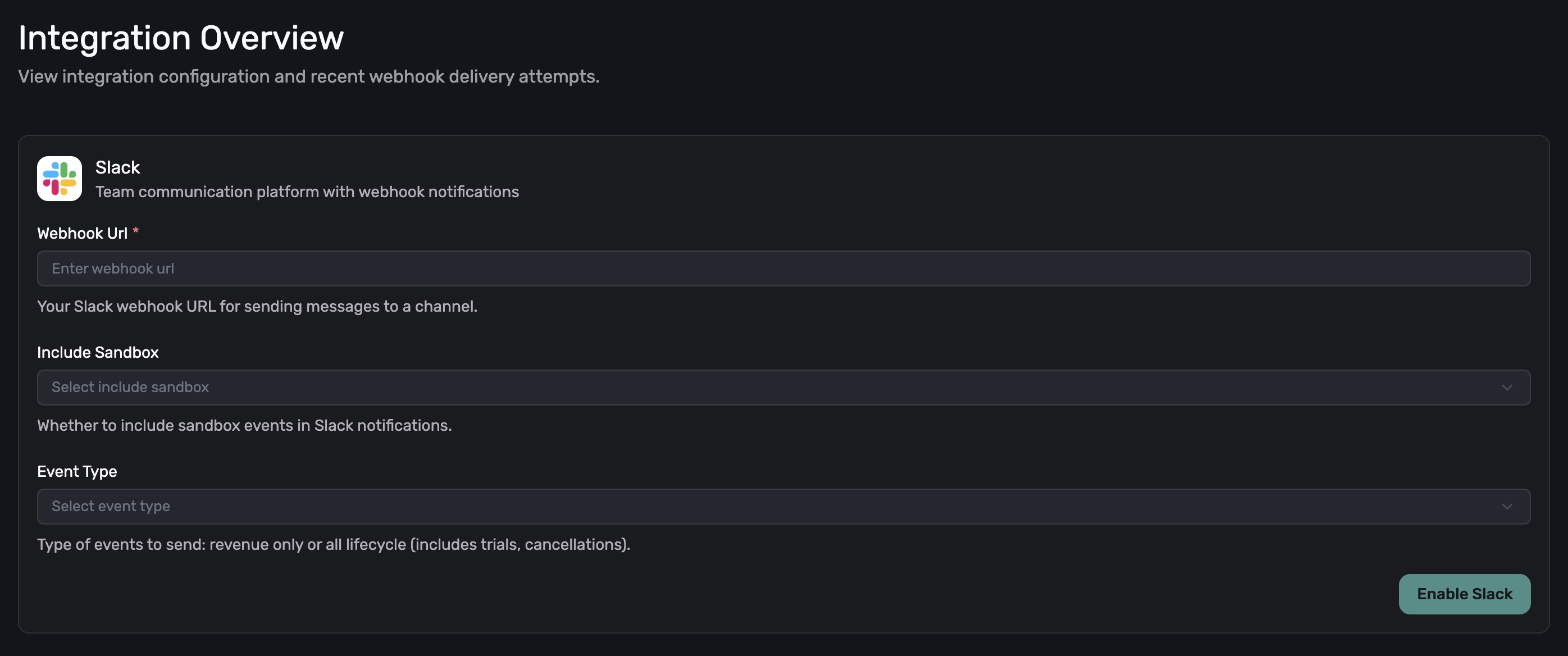 Fill out the following fields and click the Enable Slack button at the bottom right to save your changes: